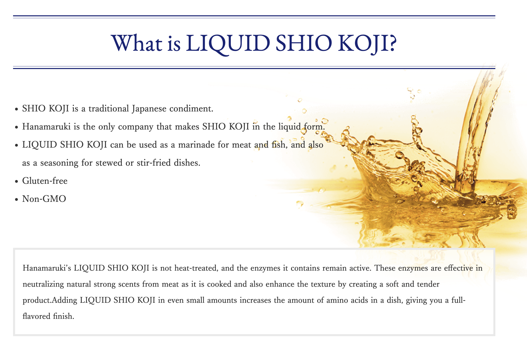 Liquid Shio Koji is a convenient, pourable form of traditional Shio Koji, made from fermented rice, salt, and koji, offering chefs an easy way to add natural umami and subtle sweetness to dishes. Compared to the paste, the liquid type is easier to measure and incorporate into marinades, sauces, and dressings, making it a versatile choice for Japanese cuisine and fusion dishes alike, while still delivering tenderizing benefits and depth of flavor.